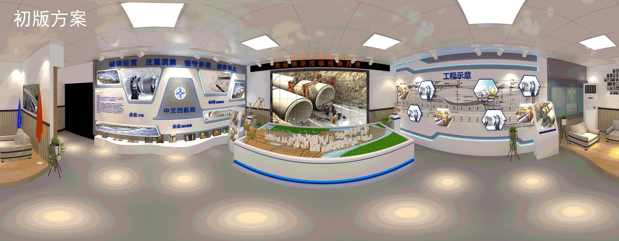 高清LED拼接幕墻,精細(xì)化動態(tài)沙盤模型,高精質(zhì)巨型項目噴繪,VR創(chuàng)新技術(shù)應(yīng)用,整合多種傳播媒介,融合企業(yè)特色文化、企業(yè)榮譽實力展示、項目工藝創(chuàng)新等元素,實力打造多媒體互動沉浸式體驗,360°全方位展示工程實況。