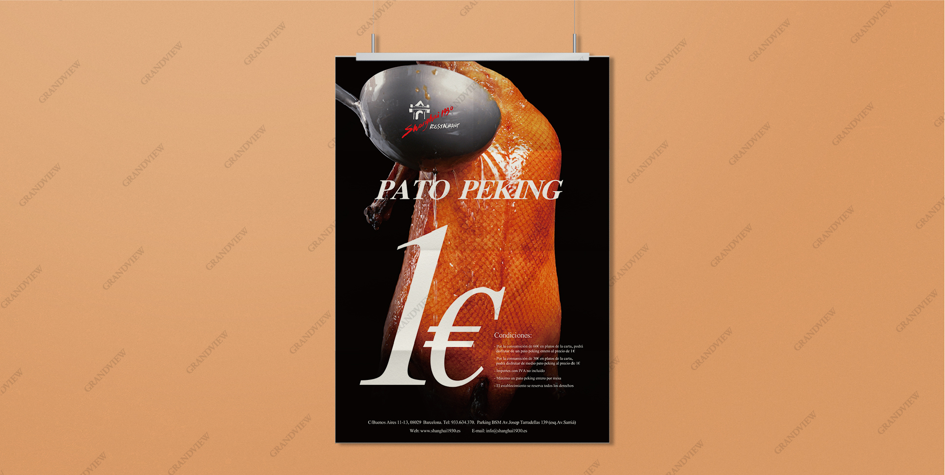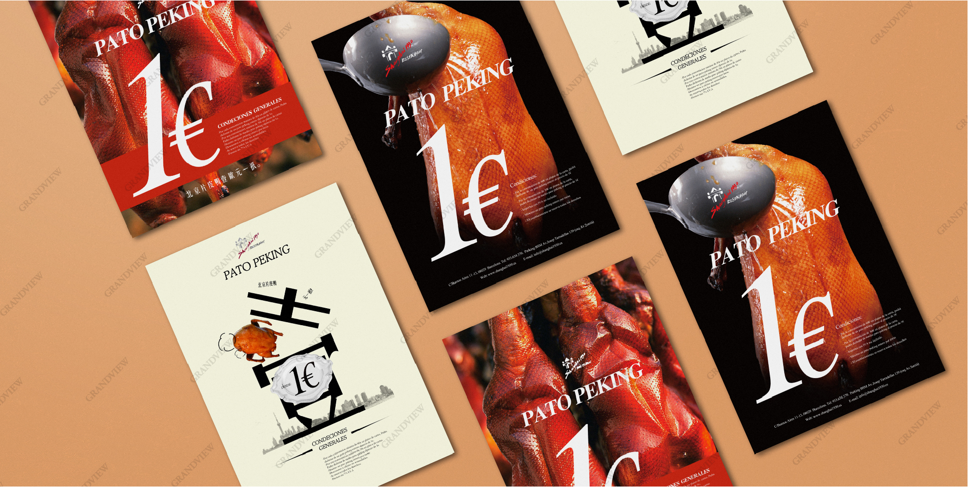 為了迎合時代消費趨勢,廣角品牌機構在平面設計中加入營銷元素——降價刺激消費。以1€的價格概念,1€就能吃到令人垂涎欲滴的烤鴨,讓消費者的消費欲望瞬間“膨脹”。設計概念一提出,國外客戶就立刻點贊稱絕,正好解決了餐廳的營銷問題,成為西班牙餐廳新一輪的營銷戰略。