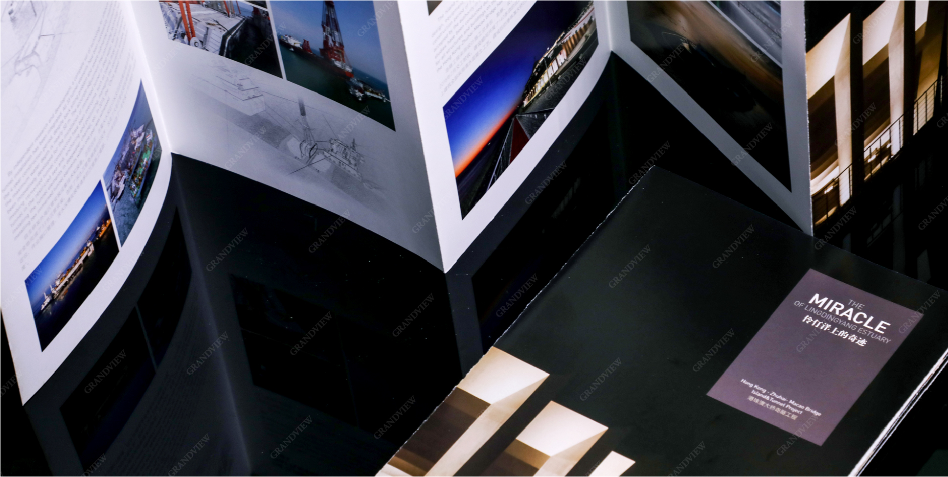 畫冊圖片以藍色為主色調(diào),與主題《伶仃洋上的奇跡》遙相呼應;多采用大跨頁精美圖片,形成強烈的視覺沖擊;板塊清晰、結構完整、既能全方位概括,又有重點突出,將島隧工程完美展現(xiàn)。